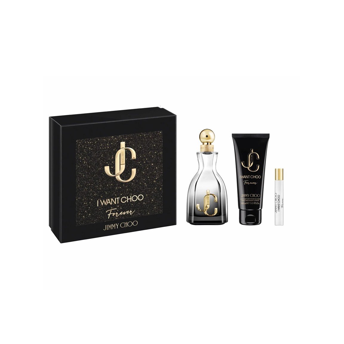 This luxurious gift set features the I Want Choo Forever fragrance, a 2022 release that serves as a deeper, more nocturnal successor to the original I Want Choo. It is an Amber Gourmet Floral scent that captures a sense of mystery and high-energy glamour, making it a standout choice for evening wear and special occasions.